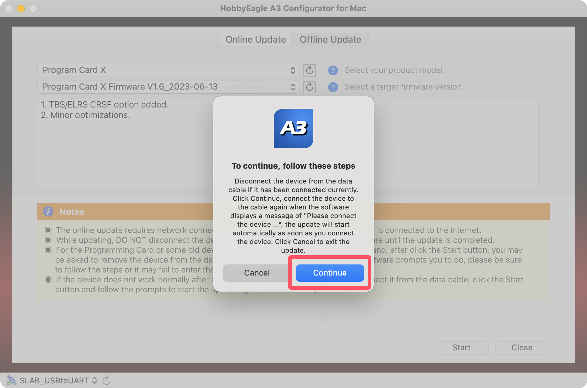 For the program card or some old devices which don't support the restart command, after click the "Start" button, the software may prompt the following message, in this case, please remove the program card or device from the data cable first, then click "Continue".