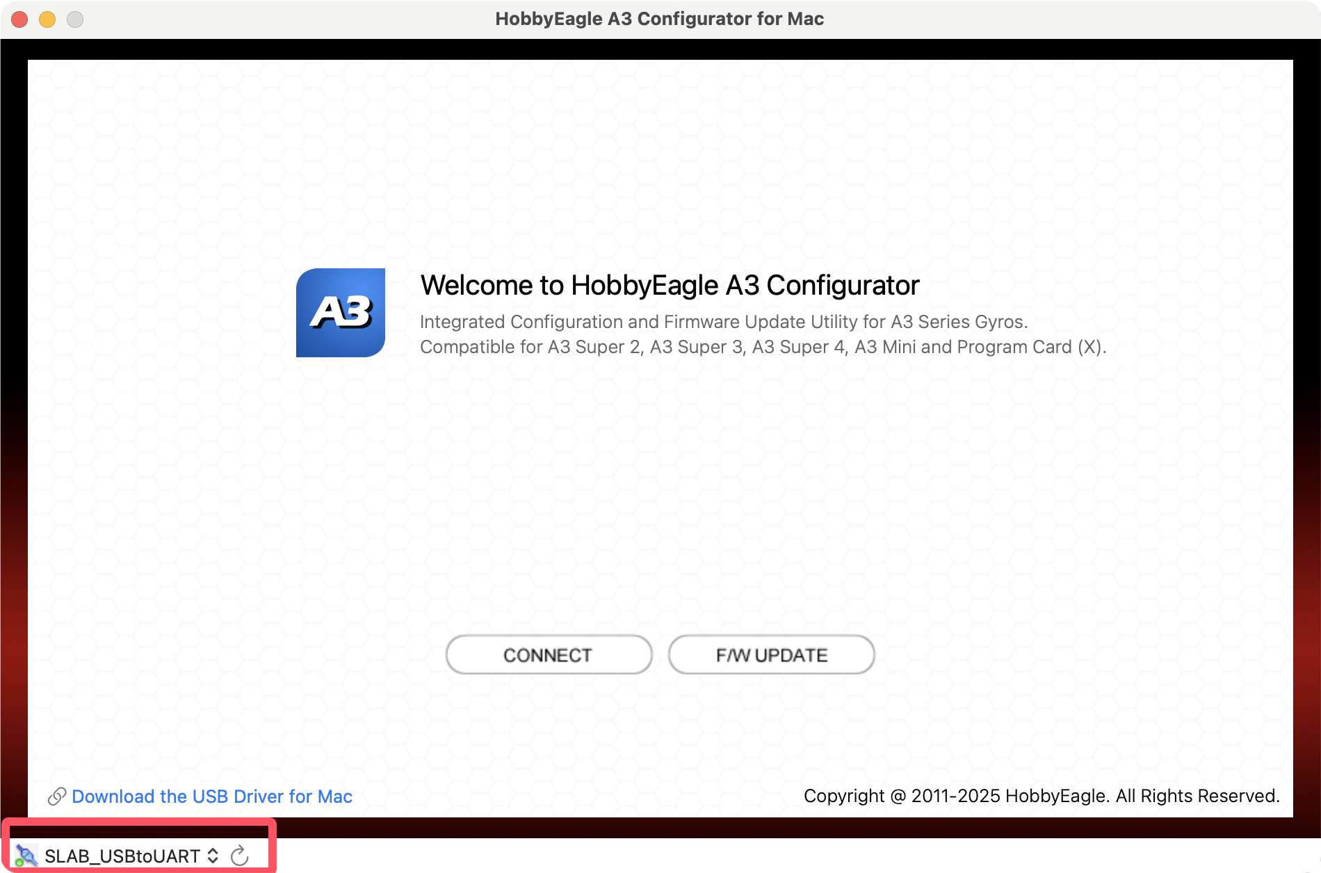 Plug the adapter into the USB port of the Mac, you may need to use an adapter cable of USB-A to USB-C if your Mac only has Type-C ports. Open the A3 Configurator and you will be directed to the welcome page. Choose the port named SLAB_USBtoUART on the bottom-left corner, the correct port will always be selected automatically if the USB driver is installed properly, if it doesn't appear in the port list, try to re-install the USB driver for Mac.