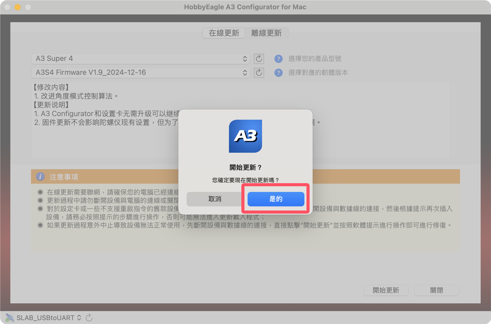 將USB適配器插入Mac的USB端口,如果您的Mac只有Type-C端口,請使用USB-A轉USB-C的轉接線進行連線。運行 A3 Configurator,打開主畫面,在左下角選擇 SLAB_USBtoUART 端口,如果您正確安裝了USB驅動程式,軟體一般情況下會自動選中該端口,如果端口列表中沒有這個端口,請重新安裝驅動程式。