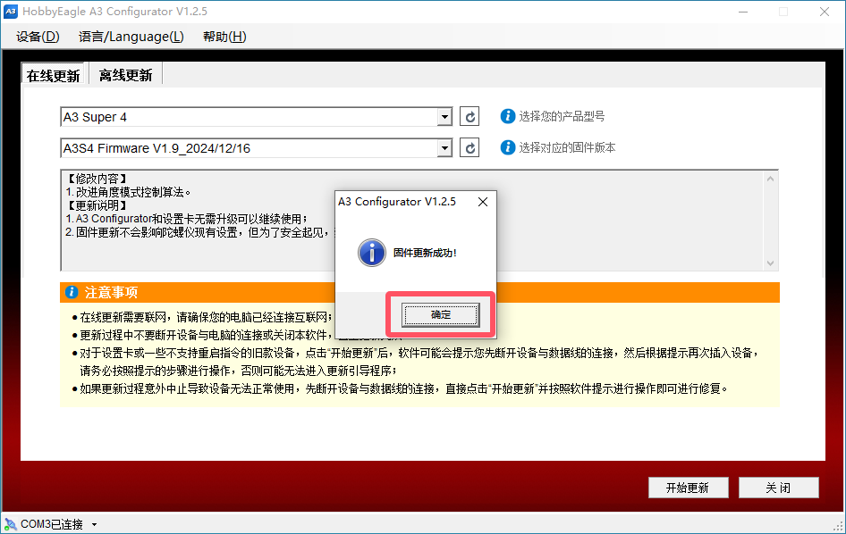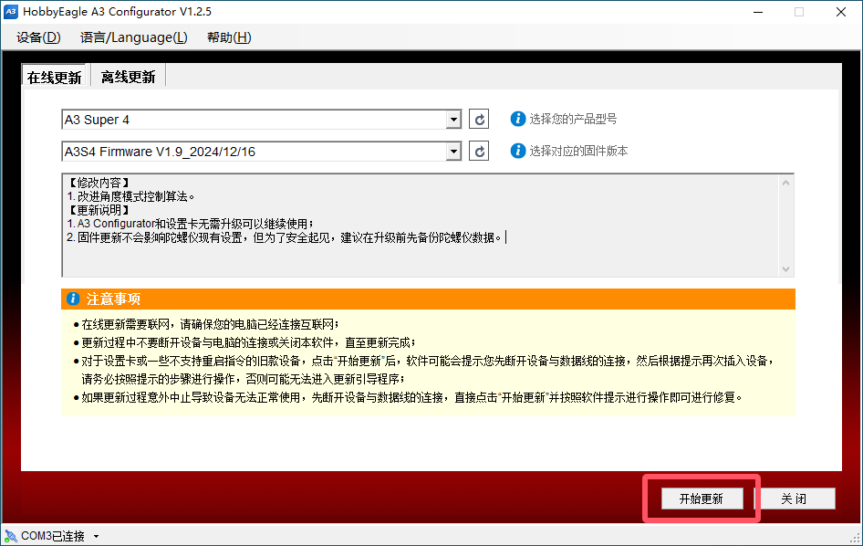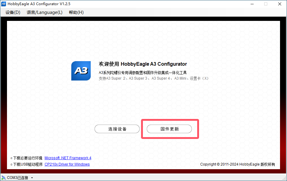 将陀螺仪连接到数据线的另一端,陀螺仪会通电自检,等待初始化完成后,点击"固件更新"按钮,打开固件更新向导: