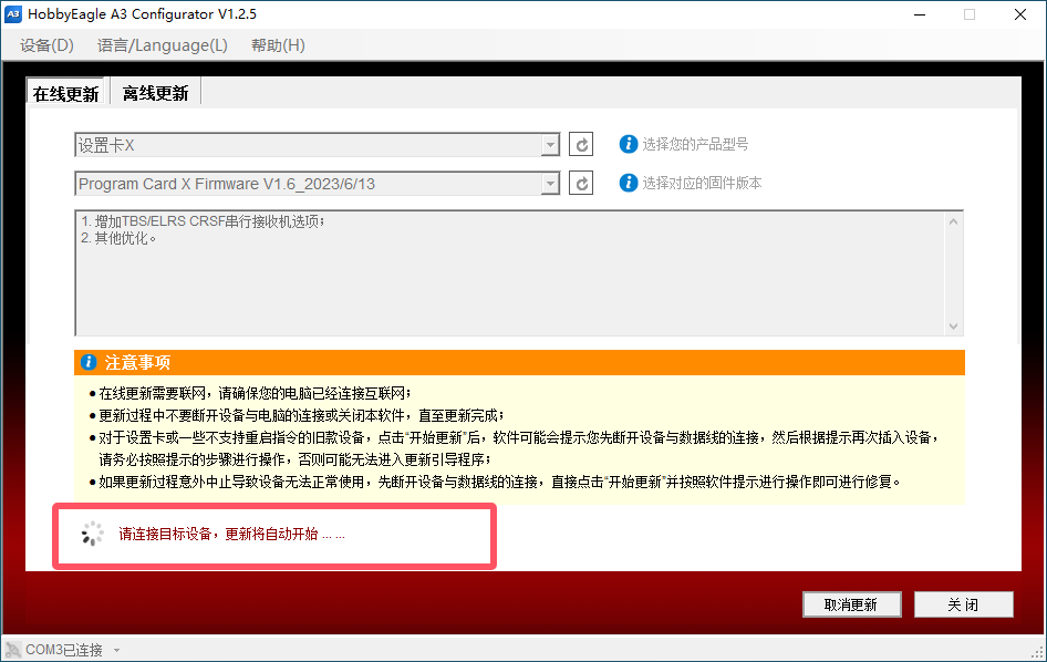 等待软件界面出现“请连接目标设备,更新将自动开始 ...”的提示信息后,此时将设置卡或设备连接到数据线的另一端,更新就会自动开始: