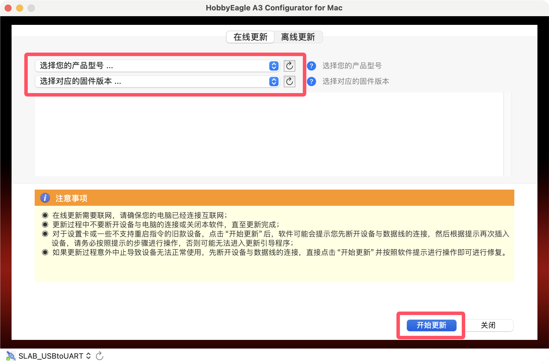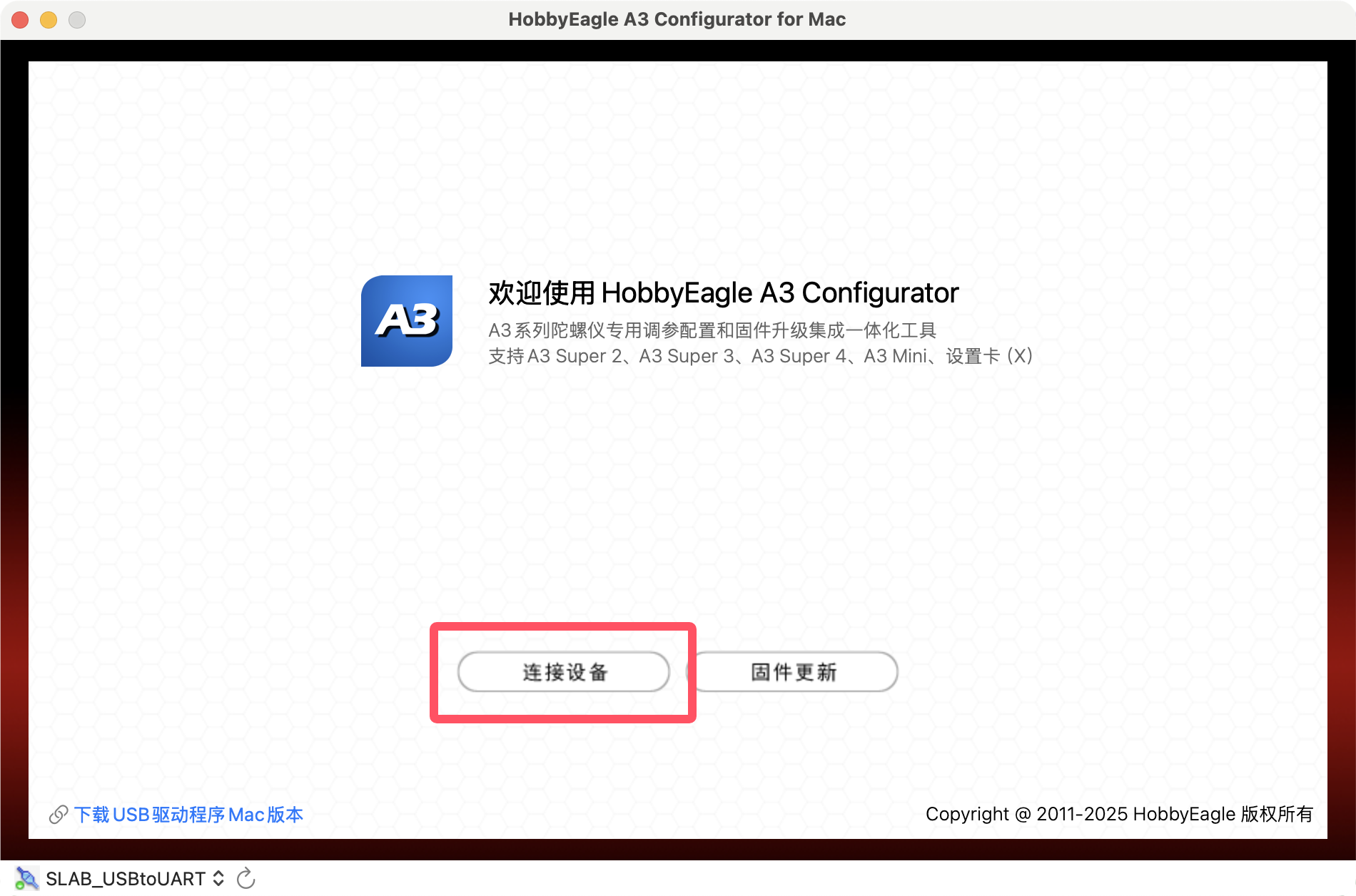 将USB适配器插入Mac的USB端口,如果您的Mac只有Type-C端口,请使用USB-A转USB-C的转接线进行连接。运行 A3 Configurator,打开主界面,在左下角选择 SLAB_USBtoUART 端口,如果您正确安装了USB驱动程序,软件一般情况下会自动选中该端口,如果端口列表中没有这个端口,请重新安装驱动程序。