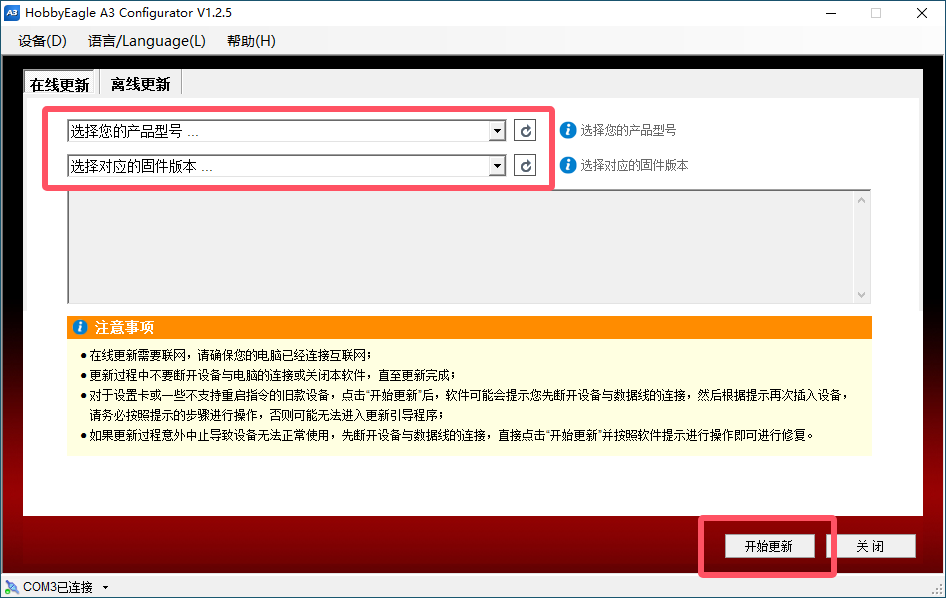 选择产品型号,选择一个固件版本,点击"开始更新"即可更新设备的固件:
