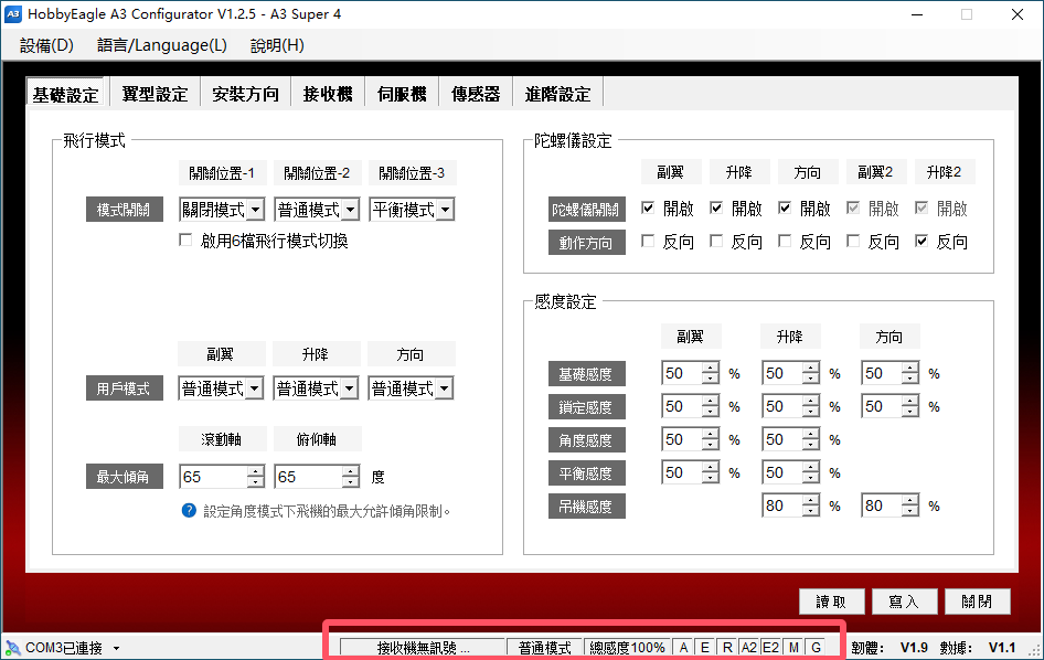 調參畫面下方顯示了陀螺儀當前的狀態資訊,包含陀螺儀狀態、飛行模式、總感度大小、各輸入通道的連接狀態等: