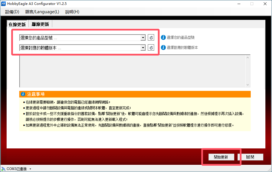 在軟體主畫面點擊"韌體更新"按鈕,載入韌體更新向導: