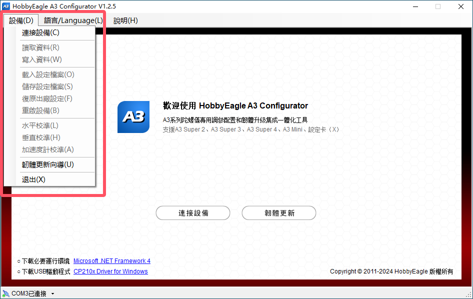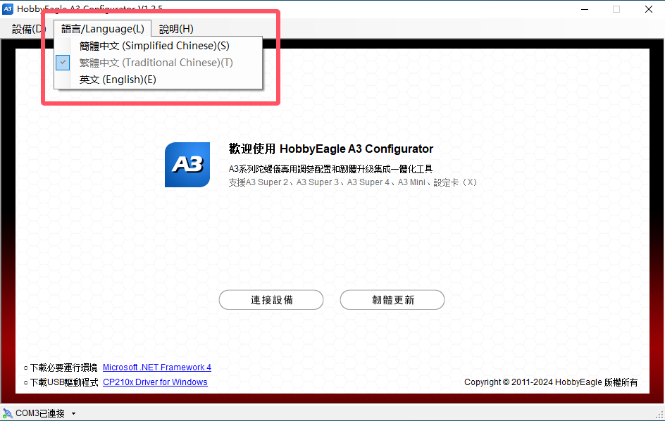 A3 Configurator支援簡體中文、繁體中文和英文介面,點擊"語言/Language"選單,選擇相應的語言,重啟軟體即可生效: