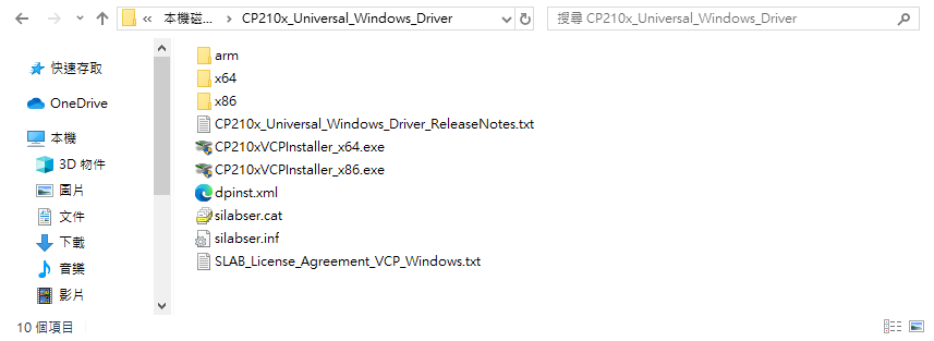 CP210x_Windows_Driver_6.7.6.zip 適用於Windows XP、Windows 7、Windows 8等早期的Windows系統;CP210x_Windows_Driver_10.1.3.zip 適用於Windows 10、Windows 11。根據您的系統選擇一個版本下載,解壓縮後裡面的內容如下圖所示: