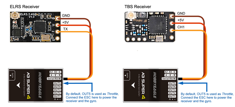 Connect the TX, VCC and GND pins to [Serial RX] of the gyro, as shown below. The RX pin is not required to connect because the gyro will only parse the channel values from the receiver but never transmit any telemetry data back to it. The pass-through channels (AUX1 or AUX2) can be used to output throttle signal for the ESC on any output pins of the gyro (the default is OUT5). Both the receiver and the gyro will get the power from the ESC.