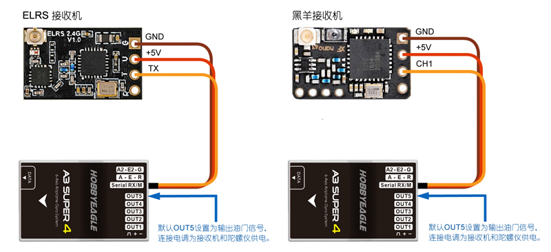 CRSF是由黑羊(Team BlackSheep)推出的高带宽、低延迟数字串行接收机协议,支持双向传输,用于在接收机和其他设备之间进行快速数据交换,目前开源遥控系统ExpressLRS的接收机也使用该协议。通过升级最新固件V1.6,A3 Super 4 和 A3 Mini 可以直接连接CRSF接收机,实现单线连接。